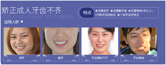 龅牙、虎牙、老鼠牙(个小牙)、地包天、前牙拥挤、前牙稀疏、牙列不齐、牙齿缺损、烤瓷失败、错过矫正黄金期的成年人以及重度四环素牙和氟斑牙等。