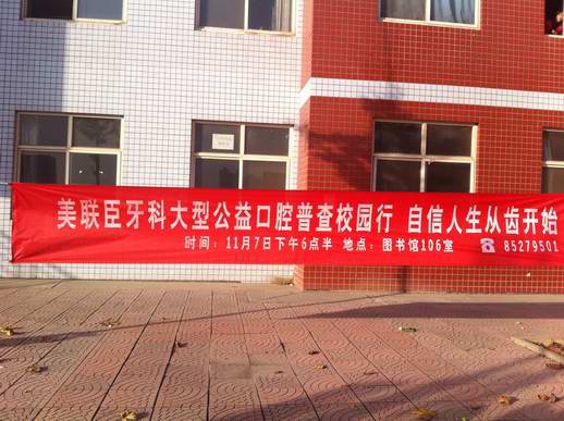 2013年11月7日,应学生热情邀请,美联臣口腔走进石家庄女子学院,开展大型公益口腔普查校园行活动。依照女子学院与美联臣口腔双方事前协定,此次校园行活动共包括口腔保健公益讲座、关爱口腔幸运抽奖、免费口腔检查等三个环节。活动时间为11月7日下午6点半,地点定于女子学院图书馆106室。
