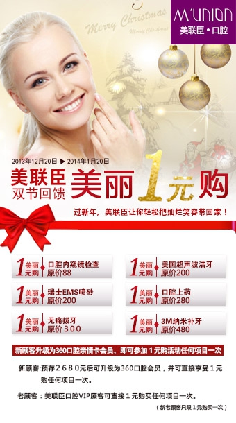 圣诞、元旦、春节陆续到来,节日气氛越来越浓。为答谢广大会员,美联臣口腔特值年终推出“美丽1元购”活动,让您带上灿烂的笑容回家过节。