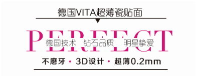 ①无需磨牙 ——vita超薄瓷贴面,采用全智能3D设计,超薄瓷贴面制作工艺,360°贴合牙齿,首次实现不磨牙,真正使牙齿完整如初。